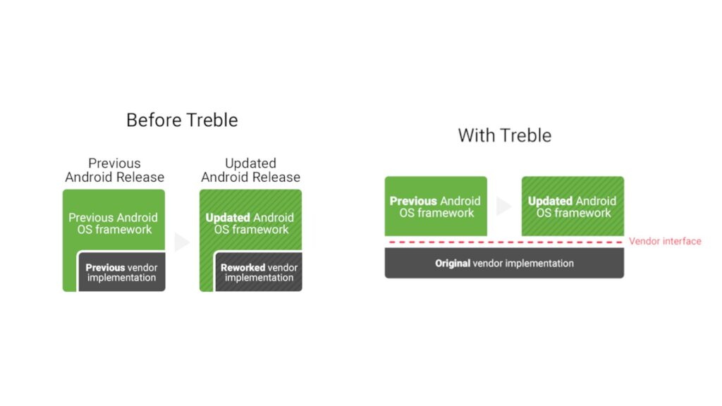 C’est ici que les GSI nous sauvent. Depuis quelques années, Google pousse à la séparation entre la partie du logiciel qui gère les composants physiques et Android même. Le but est d’avoir un même Android pour tous les appareils et une configuration spécifique à chaque appareil pour gérer le matériel. GSI signifie d’ailleurs Generic System Image, ce qui montre bien l’aspect universel de cette partie. Google a nommé ce projet Project Treble et la liste (non officielle) des appareils compatibles est disponible en ligne.